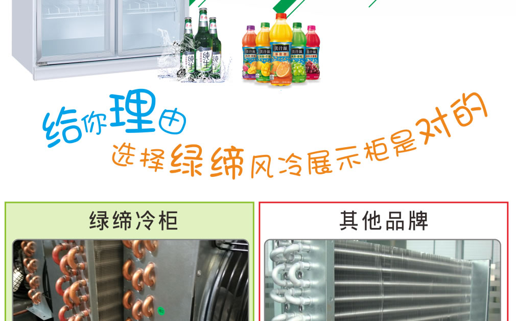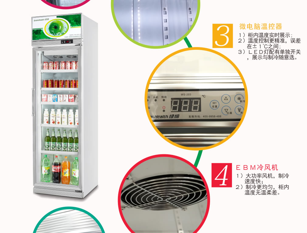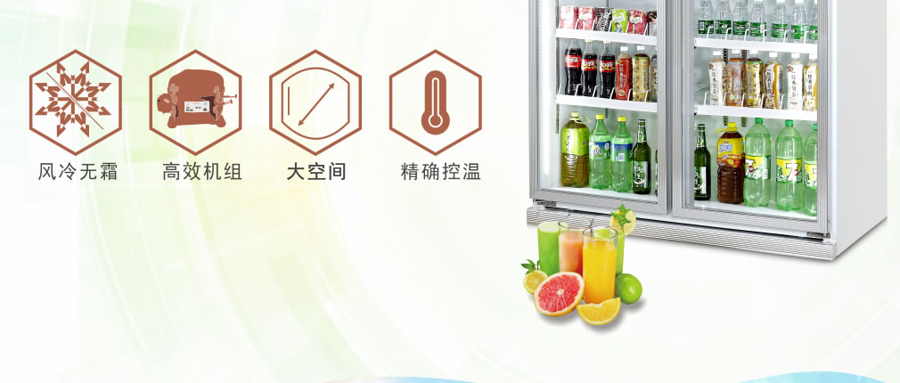 全封閉門封,不銹鋼層架勾,微電腦溫控器,EBM冷風機,高強度門鉸,高亮度LED燈,雙層中空玻璃門,360度旋轉輪,純鋼管翅片式蒸發器,翅片式冷凝器